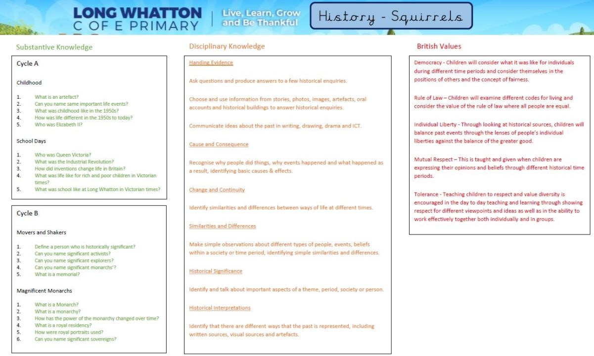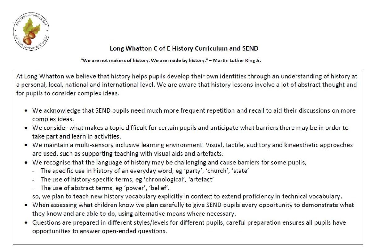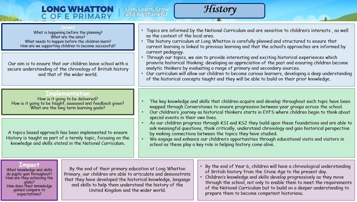 At Long Whatton, History forms part of our enchanting curriculum and benefits from subject-specific teaching throughout key stage 1 and key stage 2. Through studying History, we open doors to understanding the past.